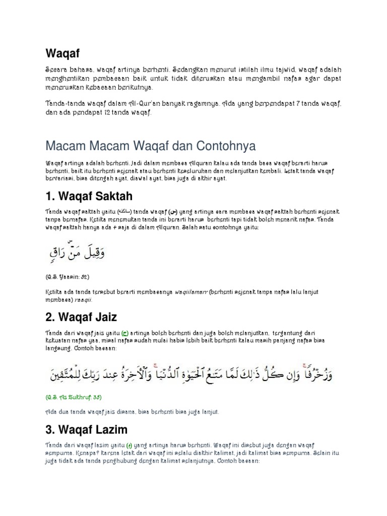 Wa-qaf Ja-iz Waqaf jaiz maknanya kita boleh memilih antara menghentikan atau melanjutkan bacaan. WAQAF menurut etimologi berarti berhentimenahan.