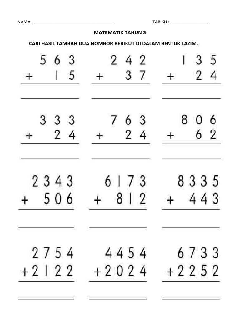 Latihan Matematik Tahun 1 Tambah Bentuk Lazim. Unit 10 panjang tahun 1. Lengkapkan jawapan kamu dalam lembaran kerja yang telah.